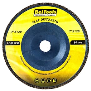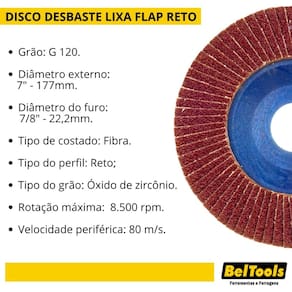 Grão: G 120. Diâmetro externo: 7" - 177mm. Diâmetro do furo: 7/8" - 22,2mm. Tipo de costado: Fibra. Tipo do perfil: Reto. Tipo do grão: Óxido de zircônio. Rotação máxima: 8.500 rpm. Velocidade periférica: 80 m/s.