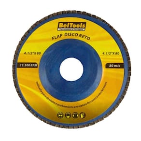Grão: G 70. Diâmetro externo: 4.1/2" - 114mm. Diâmetro do furo: 7/8" - 22,2mm. Tipo de costado: Fibra. Tipo do perfil: Reto. Tipo do grão: Óxido de zircônio. Rotação máxima: 13.300 rpm. Velocidade periférica: 80 m/s.