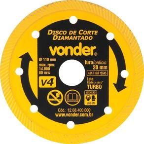 Conteúdo da embalagem1 Disco de corte diamantadoAplicações e dicas de usoIndicado para cortar cerâmica. Não indicado para porcelanato. Pode ser utilizado para cortar concreto, pedras e tijolos. Os discos de corte a seco, quando refrigerados proporcionam um melhor rendimento.Destaques e diferenciaisMaior velocidade de corte, aumentando o rendimento do trabalho. Acompanha bucha de redução de 20 mm para 16 mm. DETALHES TÉCNICOS Diâmetro externo do disco de corte diamantado: 110 mm Diâmetro do furo do disco de corte diamantado: 20 mm Refrigeração: A seco Perfil do corte: Turbo Rotação máxima rpm : 14000 rpm Segue norma: ABNT NBR 15545 Marca: Não Informado Ean: 7893946105259