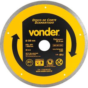 Conteúdo Embalagem:1 Disco de corte diamantadoDestaques e diferenciais:Proporciona alta performance para cortar porcelanatos e cerâmicas durasAplicações e dicas de uso:Especialmente indicado para cortar porcelanatos e cerâmicas duras. Utilizado em cortadores de cerâmicas e porcelanatos compatíveis com o diâmetro e furo do disco. Velocidade periférica máxima: 80 m/s.Características Técnicas:Diâmetro externo do disco de corte diamantado: 200 mm Diâmetro do furo do disco de corte diamantado: 25,4 mm Tipo de corte do disco de corte diamantado: Refrigerado Perfil do corte: Liso Rotação máxima rpm : 7650 /min Segue norma: ABNT NBR 15545Garantia: legal: 90 dias Marca: Não Informado Ean: 7893946563790