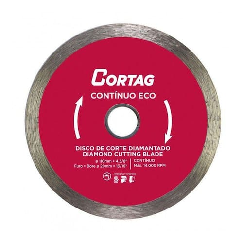 Disco diamantado contínuo eco 110mm cortag - Descrição: Utilizados para corte de cerâmica, azulejo, telha e tijolo. Características: - diâmetro do disco: 110mm; - diâmetro do furo: 20mm; - bucha de redução: 16mm; - rotação máxima: 14.000rpm; - tipo de corte: refrigerado. Conteúdo: 1 unidade. Características gerais do produto: : 90 dias de fabricante Ean: 7897451415483