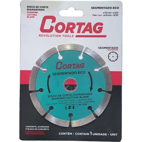 Aplicação: Concreto, Alvenaria e Bloco de Concreto. Diâmetro do disco: 110mm Diâmetro do furo: 20mm Tipo de corte: Refrigerado Bucha de redução: 16mm Rotação: 14.000 RPM