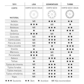 Uso a seco; Os discos de corte a seco, quando refrigerados, proporcionam um melhor rendimento Medida: 110 mm (4.1/2´); Furo de 20 mm;