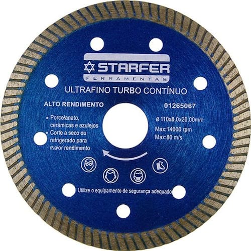 Disco diamantado porcelanato Starfer é desenhada especialmente para dar acabamento no porcelato. Dimensões: diâmetro do disco 4.3/8" 110mm x diâmetro do furo 3/4" 20mm x espessura da lamina 8mm. Para uso em serra mármore. Limite máximo 13500rpm, 80m/s. Indicado para corte ultrafino com acabamento liso em porcelanatos, cerâmicas e azulejos.