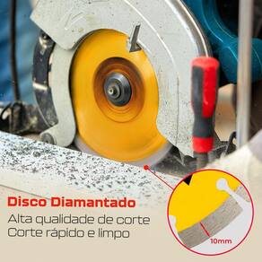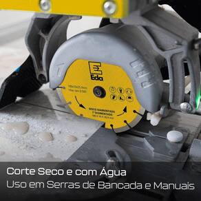 - Marca: Eda Profissional - Referência: 0QG - Diâmetro: 180mm 7 polegadas - Largura da camada diamantada: 10mm - Diâmetro do furo: 25,4mm 1 Pol. - Com adaptador para 22,23 mm 7/8 Polegadas - Espessura: 2,4mm - Indicado para cortes em gratino, mármore, basalto, pedras naturais, ardósia, lajolas, fibra de vidro, tijolos, refratários, telhas esmaltadas e coloniais - Velocidade máxima: 8.500rpm - Corte seco ou refrigerado com água - Os discos de corte a seco, quando refrigerados, proporcionam um melhor rendimento - Peso: 360 gramas - Garantia: 90 dias contra defeitos de fabricação