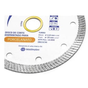 Disco diamantado turbo porcelanato 110 x 20mm - dimaestrodisco de corte fino para alta precisão e acabamento.Ideal para corte de pisos, porcelanatos e azulejos.Corte seco ou molhado corte molhado aumenta a vida útil do produto .Tamanho do disco: 110mm 4.38 furo do disco: 20mm 13/16 - acompanha bucha de redução para 16mm.Rotação máxima: 14.000 rpmcom ranhuras para passagem do ar quente, suavisando ainda mais o corte.Para afiar, corte materiais abrasivos.Tempo de garantia: 3 meses. Preço do produto em pc