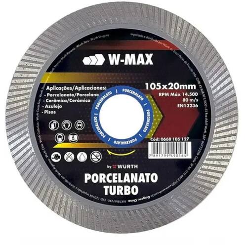 O Disco Diamantado W-max 105 X 20MM Turbo Fino Porcelanato da Wurth foi produzido para atender aplicações gerais de corte em porcelanato, mármore, cerâmica azulejos e pisos. Possui um acabamento fino e preciso e alto rendimento com corte rápido especiais.