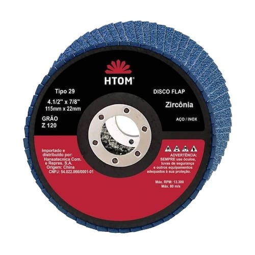 Disco Flap 115m. X 22mm para Desbaste Acabamento Htom. Indicado para desbaste e acabamento em aço inox, alumínio, metais ferrosos e não ferrosos com esmerilhadeiras angulares