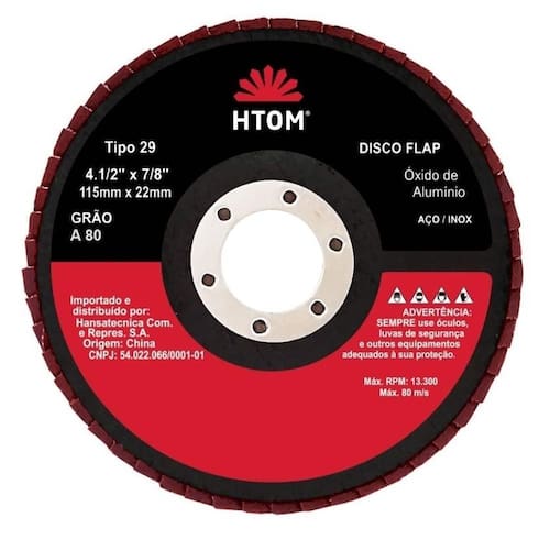 Disco Flap 115m. X 22mm para Desbaste Acabamento Htom. Indicado para desbaste e acabamento em aço inox, alumínio, metais ferrosos e não ferrosos com esmerilhadeiras angulares