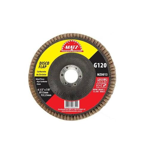 Informações Técnicas: Tipo de corte: A seco Grão: 120 Acabamento fino Diâmetro externo: 115mm 4.1/2'' Diâmetro do furo: 22,23mm 7/8'' Rotação máxima por minuto: 13.300 - 80m/s Uso em: - Aço Inox - Aço Carbono Proporciona qualidade e produtividade na operação Produto de altíssima qualidade com alta performance