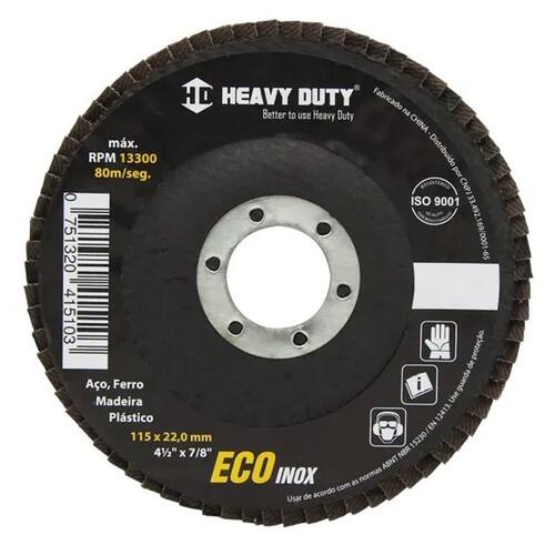 O DISCO FLAP ECOINOX FIBRA RETO 4.1/2 GRANA 60 da Heavy Duty é um produto utilizado em lixadeiras e esmerilhadeiras angulares. Realiza o desbaste e o acabamento ao mesmo tempo. É indicado para operações em metais ferrosos e não ferrosos, aços carbono e de construção.