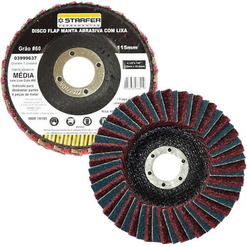 Especificações Técnicas: Material: Fibra, tecido sintético e óxido de alumínio Diâmetro: 4.1/2 115 mm Furo: 7/8 22,23 mm Manta: Média vermelha Grão 60 Abas: 28 25 mm x 17 mm cada Rotação máxima: 13.300 RPM Velocidade linear máxima: 80 m/s Quantidade: 1 unidade Referência: 3999637 Marca: Starfer