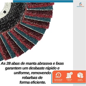 Características: Desempenho Eficiente: As 28 abas de manta abrasiva e lixas sobrepostas flaps garantem um desbaste rápido e uniforme, removendo rebarbas com facilidade e eficiência. Precisão e Versatilidade: A manta média vermelha com grão 60 proporciona um equilíbrio perfeito entre desbaste e acabamento, ideal para superfícies regulares e irregulares. Alta Durabilidade: Projetado para suportar altas rotações, o disco resiste até 13.300 RPM, garantindo excelente durabilidade e desempenho em trabalhos contínuos. Aplicações Diversas: Perfeito para uma variedade de tarefas, desde o desbaste inicial até o acabamento final em diferentes tipos de metais.
