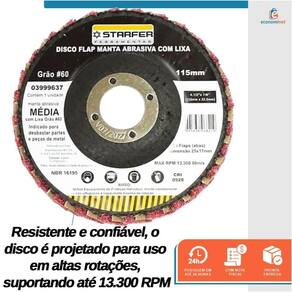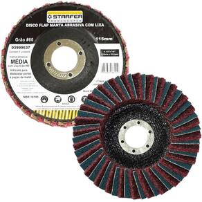 Especificações Técnicas: Material: Fibra, tecido sintético e óxido de alumínio Diâmetro: 4.1/2 115 mm Furo: 7/8 22,23 mm Manta: Média vermelha Grão 60 Abas: 28 25 mm x 17 mm cada Rotação máxima: 13.300 RPM Velocidade linear máxima: 80 m/s Quantidade: 1 unidade Referência: 3999637 Marca: Starfer Marca: Não Informado