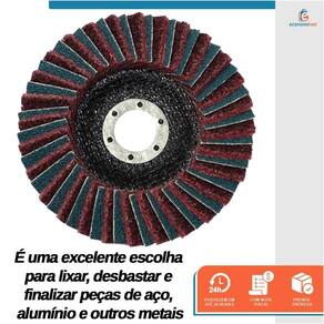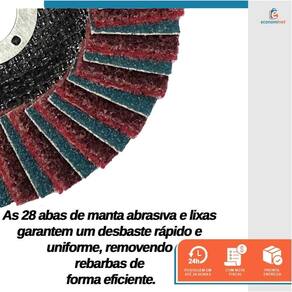 Características: Desempenho Eficiente: As 28 abas de manta abrasiva e lixas sobrepostas flaps garantem um desbaste rápido e uniforme, removendo rebarbas com facilidade e eficiência. Precisão e Versatilidade: A manta média vermelha com grão 60 proporciona um equilíbrio perfeito entre desbaste e acabamento, ideal para superfícies regulares e irregulares. Alta Durabilidade: Projetado para suportar altas rotações, o disco resiste até 13.300 RPM, garantindo excelente durabilidade e desempenho em trabalhos contínuos. Aplicações Diversas: Perfeito para uma variedade de tarefas, desde o desbaste inicial até o acabamento final em diferentes tipos de metais.