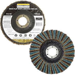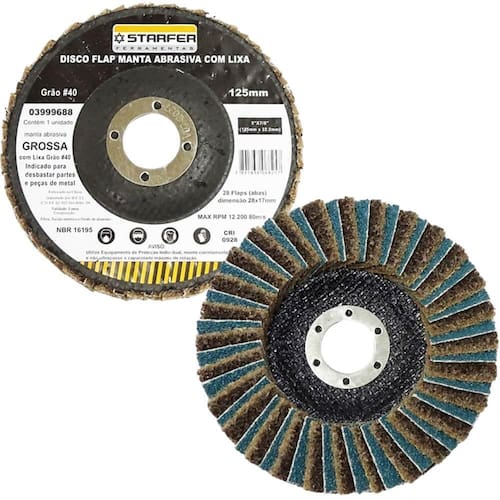Especificações Técnicas: Material: Fibra, tecido sintético e óxido de alumínio Diâmetro: 5 125 mm Furo: 7/8 22,23 mm Manta: Grossa amarela Grão 40 Abas: 28 28 mm x 17 mm cada Rotação máxima: 12.200 RPM Velocidade linear máxima: 80 m/s Quantidade: 1 unidade Referência: 3999688 Marca: Starfer