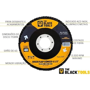 A The Black Tools é uma marca comprometida com a qualidade e as necessidades do cliente. Nosso objetivo é oferecer as melhores soluções para o seu dia a dia, com um design funcional e inovador. KIT COMPOSTO POR: - 10 Discos De Desbaste Grão 40 Tipo Flap 115mm X 22mm - The Black Tools O Disco é indicado para desbastes, acabamento em aço inox, alumínio, metais ferrosos e não ferrosos, madeira e plástico. Aplicações em estruturas metálicas, indústria naval, fundições de metais ferrosos e indústria automobilística. Utilizado em máquinas angulares rotativas de acionamento elétrico ou pneumático CARACTERÍSTICAS: - Indicado para desbaste e acabamento em aço inox, alumínio, metais ferrosos e não ferrosos. - Desbaste e acabamento na mesma operação. - Utilizado em esmerilhadeiras angulares. - Dimensões do Disco: 115mm. - Melhor aproveitamento. - Informações Técnicas. - Costado de fibra. - Menor vibração. - Furo de 22mm. - Grão de 40. - Tipo flap. OBSERVAÇÕES: - É utilizado para desbaste em metal, madeira e outros materiais. 'imagens Ilustrativa'. - Não exceda a velocidade do rpm especificada no disco. - Polimento molhado não é permitido. FICHA TÉCNICA: - Diâmetro 115 mm 22,2 mm. - Max 13 300 rpm. - Grão 40. Marca: The Black Tools Modelo:btf440 : 03 Meses SKU: KIT23101x10 Marca: Não Informado Ean: 79031467400218