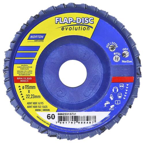 - O Flap-Disc Evolution é um disco composto por aletas de lixa com costado de tecido, aplicadas em suporte externo de plástico, e grão Norzon, que promove excelente poder de remoção.
