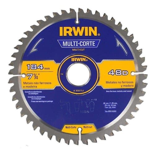 Disco Para Serra Circular Multicorte 48 Dentes Irwin Características: Widea 184mm x 30mm Revestimento resistente à corrosão Ideal para cortes finos em madeiras macias e duras. Marcenerios e fábricas de móveis. Corpo temperado para maior durabilidade.