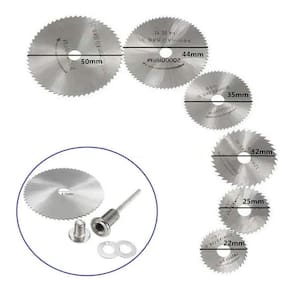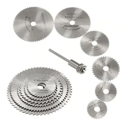 Disco serra circular para madeira dremel e furadeira c/7 peças Kit 7 em 1 mini disco serra circular micro retifica dremel Adequado para corte de tubos e hastes de cobre ou pvc, madeira, mdf, resina, canaletas de plástico, cortar tubos elétricos, alumínio, cobre, acrílico, bronze e latão. Ideal para pequenas reformas, reparos, artesanato, fabricação de brinquedos, molduras e miniaturas. Estes discos de serra transformam sua ferramenta micro retífica dremel ou similar em uma pequena serra circular de precisão para realizar cortes retos e finos em todos os tipos de madeira e nos demais materiais especificados acima. Poderá ser utilizada em locais de difícil acesso onde as serras maiores não alcançam e é necessário uma precisão superior a de serras verticais. Itens inclusos: 01- disco de 22 mm 01- disco de 25 mm 01- disco de 32 mm 01- disco de 35 mm 01- disco de 44 mm 01- disco de 50 mm 01- haste de mandril 1/8