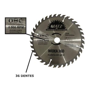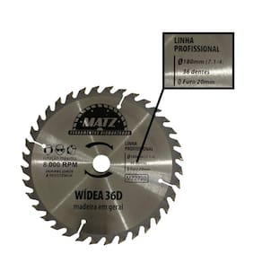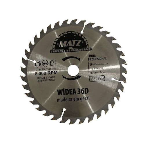 Informações técnicas: Perfil do corte: Serra Tipo de corte: A seco e refrigerado Dimensões: - Diâmetro externo: 180mm 7.1/4'' - Diâmetro do furo: 20mm - Espessura: 2mm Quantidade de dentes: 36 Rotação máxima por minuto RPM : 8.000 - 80m/s Para corte de: Madeira em geral Proporciona qualidade e produtividade na operação Produto de altíssima qualidade com alta performance
