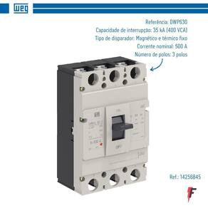 Características técnicas: Modelo: dwp630l-500-3 Referência: 14256845 Capacidade de interrupção: 35 ka Tipo de disparador: magnético e térmico fixo Corrente nominal: 500a Número de polos: 3 Ean: 7909323874448
