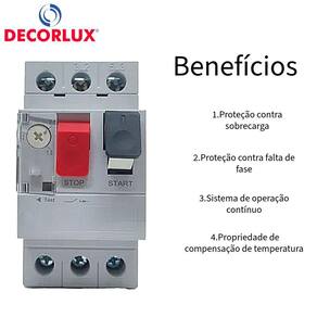 Disjuntor Motor Tripolar 32A Ajuste 1.6-2.5A Decorlux Disjuntor Motor é um dispositivo para proteção de motores contra curto circuito. Sobrecarga e falta de fase associado ao relé térmico acoplado. Interrompe correntes em condições anormais. Utilizados para a proteção e o comando de motores, em conjunto com um contator em condições normais e proteção por interrupção de correntes em condições anormais curto-circuito e sobrecarga . Permitem o arranque de motores com tensão plena, proteção contra sobrecargas e curtos-circuitos, em regime AC3. Especificações Técnicas: Marca: Decorlux Modelo: DM3207 Tensão: 690Vac Corrente: 32A Corrente de Ajuste: 1.6-2.5A Tensão nominal de isolação Ui : 690V Freqência nominal: 50/60Hz Grade de poluição: Grade III Acionamento: 2-botões Temperatura ambiente: -540ºC, , média de temperatura em 24h não excedendo +35C. Altitude de instalação: