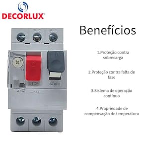 Disjuntor Motor Tripolar 32A Ajuste 4.0-6.3A Decorlux Disjuntor Motor é um dispositivo para proteção de motores contra curto circuito. Sobrecarga e falta de fase associado ao relé térmico acoplado. Interrompe correntes em condições anormais. Utilizados para a proteção e o comando de motores, em conjunto com um contator em condições normais e proteção por interrupção de correntes em condições anormais curto-circuito e sobrecarga . Permitem o arranque de motores com tensão plena, proteção contra sobrecargas e curtos-circuitos, em regime AC3. Especificações Técnicas: Marca: Decorlux Modelo: DM3210 Tensão: 690Vac Corrente: 32A Corrente de Ajuste: 4.0-6.3A Tensão nominal de isolação Ui : 690V Freqência nominal: 50/60Hz Grade de poluição: Grade III Acionamento: 2-botões Temperatura ambiente: -540ºC, , média de temperatura em 24h não excedendo +35C. Altitude de instalação: