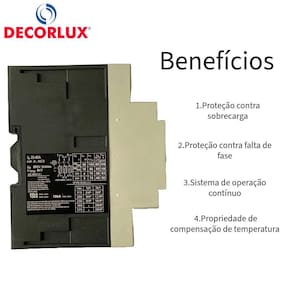 Disjuntor Motor Tripolar 80A Ajuste 40.0-63.0A Decorlux Disjuntor Motor é um dispositivo para proteção de motores contra curto-circuito. Sobrecarga e falta de fase associado ao relé térmico acoplado. Interrompe correntes em condições anormais. Utilizados para a proteção e o comando de motores, em conjunto com um Contator em condições normais e proteção por interrupção de correntes em condições anormais curto-circuito e sobrecarga . Permitem o arranque de motores com tensão plena, proteção contra sobrecargas e curtos-circuitos, em regime AC3. O relé térmico acoplado protege contra a falta de fase e sobrecargas. O acionamento manual do disjuntor motor é feito pelos botões frontais, e a corrente térmica é regulada no botão de ajuste. Especificações Técnicas: Marca: Decorlux Modelo: DM8063 Tensão: Até 690Vac Corrente: 80A Corrente de Ajuste: 40.0-63.0A Tensão nominal de isolação Ui : 690V Freqência nominal: 50/60Hz Grade de poluição: Grade III Acionamento: 2-botões Temperatura ambiente: -540ºC, , média de temperatura em 24h não excedendo +35C. Altitude de instalação: