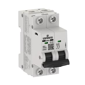 Características Principais: Marca: Soprano Modelo: 3kA Composição: Termoplástico e elementos metálicos Número de polos: 2 Corrente Nominal (In): 25A Classe de Proteção: classe 1 Tensão de Operação Nominal (Ue): 230/400Vca Curva de disparo termomagnética: tipo C - (5 a 10) x In EAN: 7891154190104
