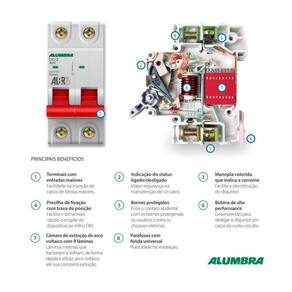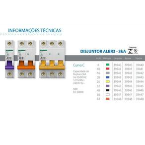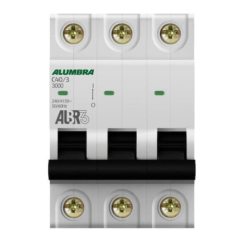 Disjuntor Tripolar 3P 40A Curva C ALBR3 Alumbra Disjuntor Tripolar 3P Curva C 40A 3kA ALBR3 Alumbra Os disjuntores termomagnéticos ALBR3 e ALBR6 foram projetados com tecnologia exclusiva Alumbra. protegem as instalações elétricas e o patrimônio de seus usuários contra curto-circuito e sobrecarga, oferecendo segurança sob medida e dupla proteção. Toda instalação elétrica merece os disjuntores ALBR3. Eles protegem os circuitos elétricos e seus componentes fios, cabos, interruptores, tomadas, etc contra curtos-circuitos e sobrecargas. E o melhor, com preços acessíveis. FIQUE TRANQUILO O selo Inmetro garante que todos os disjuntores ALBR3 foram produzidos sob o mesmo padrão de qualidade certificada. Caracteristicas Técnicas:- Corrente: 40 Amperes;- Tensão Operação: 110 a 415V- Curva: C;- Certificação Inmetro;- Capacidade de Ruptura: 3kA - NBR IEC 60898;- Referência: 39446;