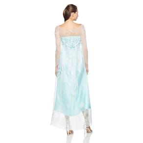 Frozen é um filme estadunidense de 2013, do gênero comédia musical animado por computador, produzido pelos estúdios de animação Walt Disney e lançado pela Walt Disney Pictures. O filme conta a história de uma princesa destemida que parte em uma jornada épica ao lado de um homem da montanha robusto e em busca de emoção, suas leais renas de estimação e um infeliz boneco de neve para encontrar sua irmã distante, cujos poderes gelados inadvertidamente aprisionaram o reino no inverno eterno. Este traje de luxo Elsa apresenta um belo vestido azul com mangas grossas, corpete de lantejoulas e uma sobreposição com flocos de neve brilhantes, redemoinhos e gelo