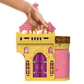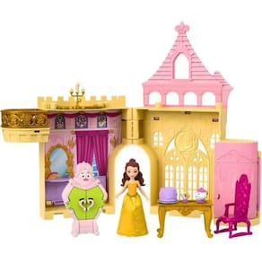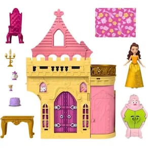 Uma charmosa casa de bonecas em pequena escala, o castelo se abre para revelar várias áreas de lazer, além de uma boneca Bela, 4 amigas, móveis e muito mais.