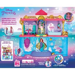 Inspirado na clássica animação da Disney, A Pequena Sereia, este conjunto de castelo permite que as crianças recriem momentos do cinema de ambos os reinos de Ariel: a terra e o mar O conjunto tem 31 cm de altura e inclui 6 áreas para brincar que as crianças reconhecerão no filme, além do adorável amigo de Ariel, Linguado. O reino terrestre da Ariel inclui uma pista de dança giratória para as celebrações do castelo, o quarto de Ariel e uma sala de jantar com várias peças para brincar inspiradas em diversas comidas. O reino subaquático de Ariel tem uma piscina onde as crianças podem apertar um botão para fazer a água espirrar. Ele também inclui um balanço de concha e uma fonte onde Ariel e Linguado podem se prender para se divertir girando. As crianças podem transformar a boneca pequena 8,8 cm Ariel de sereia em humana com dois estilos: o estilo rosa de castelo e uma roupa roxa de sereia que fica azul quando colocada na água. Vários conjuntos Storytime Stackers podem ser empilhados ou conectados lado a lado. Os fãs podem colecionar todos os conjuntos e acessórios Disney Princesas para criar o maior dos reinos