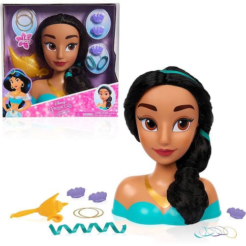 A Disney Princess Jasmine Styling Head tem infinitas possibilidades de jogo de cabelo! Jasmine apresenta cabelos lindos e brilhantes que são perfeitos para escovar e estilo. Esta princesa aventureira vem com 13 acessórios divertidos de desgaste e compartilhamento de acessórios, incluindo: 1 escova de cabelo de lâmpada mágica, 3 barras de flores, 2 laços de cabelo brilhantes, 2 fitas de cabelo e 5 bandas elásticas. As crianças podem usar a escova de lâmpada mágica da Jasmine para escovar o cabelo e criar muitos estilos de cabelo divertidos! Sua pequena vai adorar usar os adoráveis clipes de cabelo para estilizar e decorar o cabelo de Jasmine e as crianças podem até usar as barras e fitas em seus próprios cabelos para ainda mais diversão de moda! Idade 3+