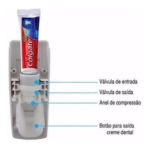Não utiliza pilhas, acionado por mecanismo mecânico O creme dental sai automaticamente, em quantidade necessária para uma excelente escovação Utiliza um sistema de vácuo, desta maneira tira toda a pasta dentro do tubo sem a necessidade de ficar espremendo com as mãos. Evita desperdícios, economizando creme dental Formato de bico universal, adaptável a todos os tipos de tubos de creme dental Acompanha porta escova, com capacidade para até 5 escovas