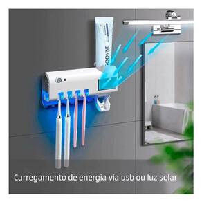 Dispenser Automático Pasta e Suporte Escova de Dente Descrição: Possui esterilização inteligente através de raios ultravioletas UV-A , que destroem a estrutura molecular das bactérias fazendo agindo em segundos. Dispensa o uso constante de eletricidade. Espremedor de pasta de dente com quantidade segura recomendada por profissionais da saúde bucal. Além de dispensar furos na parede para fixação do aparelho. Informações Técnicas:Capacidade : 4 escovas dentais e 1 pasta de dentalIndução infravermelhaMaterial : PlásticoCarregamento por USBItens Inclusos:1x Porta escovas de dentes1x Cabo USBPalavras Chaves Mais Pesquisadas:Porta escovaInteligenteUltravioletaDispenserAplicadorTítulos com Palavras Chaves:Suporte Dispenser Escova de Dente com esterilizador UVPorta Escova de Dentes Pasta Automático e Esterilizador UV Aplicador Pasta de Dente Dispenser Escovas UV