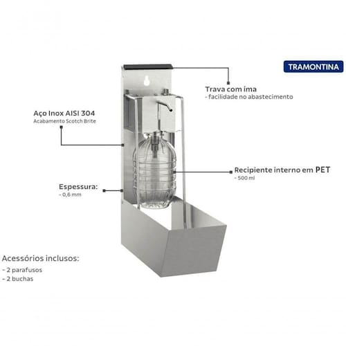 Para garantir sua higiene e dos frequentadores dos seus ambientes, conte com o dispenser de álcool gel e sabão líquido Tramontina em aço inox com acabamento escovado. Com capacidade de 500 ml, conta com um design exclusivo que permite a colocação nos ambientes mais variados, sejam corporativos ou comerciais. Sua fabricação é em aço inox com acabamento escovado, material que é muito resistente e durável!