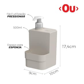Dispenser de detergente e esponja pia bancada 500ml cores Cor: branco Dispenser de detergente e esponja pia bancada 500ml cores pronta-entregaproduto original - acompanha nota fiscaldisponível em estoqueescorre a água O produto possui furos na parte inferior para a vazão da água Cores disponíveis: azul, bege, branco, cinza, preto e vermelho Medidas do produto:Altura: 17,4cm Largura: 10cm Comprimento: 9cm Peso: 95g Seu lar com um toque de praticidade o dispenser para detergente e esponja trium compact 500 ml é perfeito para quem procura funcionalidade e beleza sobre a pia, pois permite a organização de forma versátil além de otimizar o espaço do ambiente. Com design minimalista, ele combina com todos os tipos de cozinhas ou varandas gourmet. O dispenser possui válvula dosadora que permite dosagem do detergente gerando economia, e compartimento para esponja que é fechado, ou seja, o produto vai da pia direto para a gaveta ou armário sem escorrer água. Fabricado em material resistente e flexível (polipropileno), além do plástico ser texturizado impedindo riscos e facilitando a higienização. Praticidade, beleza e design são as características da linha trium pensadas para proporcionar qualidade na organização da sua pia. Obs: imagens meramente ilustrativas