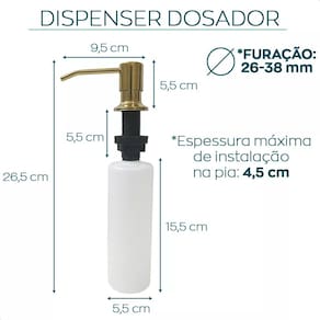 Sua instalação é fácil, ele é o Dispenser ideal para colocar ao lado da sua pia ou torneira, é preciso apenas preparar a superfície com um furo vazado e embutir seu dosador.