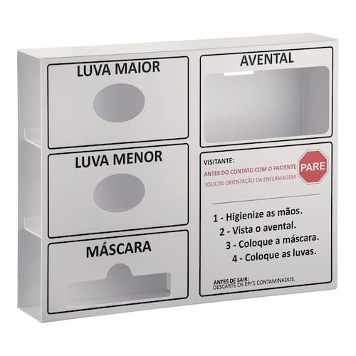 Modelo exclusivo de encaixe de embalagem de luvas, máscaras e aventais. Use diretamente no suporte. Possibilidade de fabricação de modelos de Dispensers personalizados. Acompanha kit para fixação na parede, contendo: bucha, parafuso e fita dupla-face. Indicados para armazenar Equipamentos de proteção individual de uso único.
