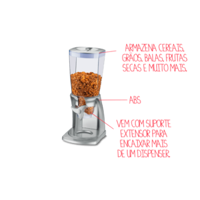 Guarde e conserve os seus cereais e decore a sua cozinha. Além de elegante, o dispenser para cereais da linha Lyon é multiuso e também pode armazenar grãos, balas e frutas secas. Prático e resistente, o produto da linha é fácil de limpar e possui um suporte extensor, que permite acoplar mais de um dispenser. Suas dimensões são 35x17x21cm.
