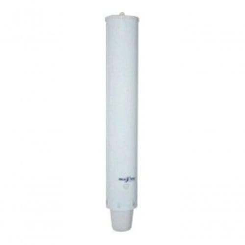 Dispenser cilíndrico para copos descartáveis de plástico, com capacidade para 100 unidades. Construído em aço carbono, com acabamento em pintura epóxi branca.