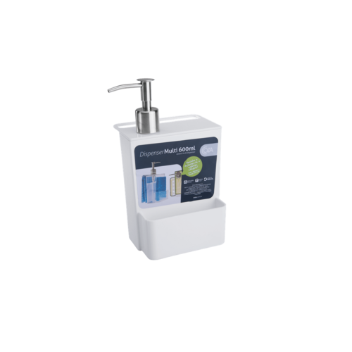 Na hora de manter a pia organizada, o Dispenser Multi, criado para a linha Sobre a Pia, cai como uma luva. O organizador de pia acomoda o detergente, a esponja e até mesmo o paninho para secar a pia, pois o produto tem uma alça especialmente para este fim, que o mantém sempre sequinho. Os furos internos evitam que a esponja fique em contato com a água e estrague. Sua pia vai ganhar um ar moderno e organizado. No compartimento do detergente, que comporta 600ml, o bico dosador também evita desperdícios.