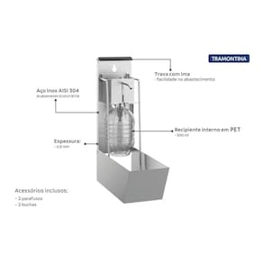 Dispenser Para Sabão E álcool Gel Tramontina Inox 500 Ml Dispenser para Sabão e Álcool Gel Tramontina em Aço Inox com Acabamento Scotch Brite e Recipiente em PET 500 ml Manter a higiene e a limpeza das mãos é essencial, e contar com itens que te ajudem neste objetivo é ainda melhor. O dispenser de sabão líquido e álcool gel, fabricado em aço inoxidável com acabamento escovado de 500 ml funciona através do acionamento manual, além de possuir um design exclusivo que o permite se adaptar aos mais variados tipos de ambientes.