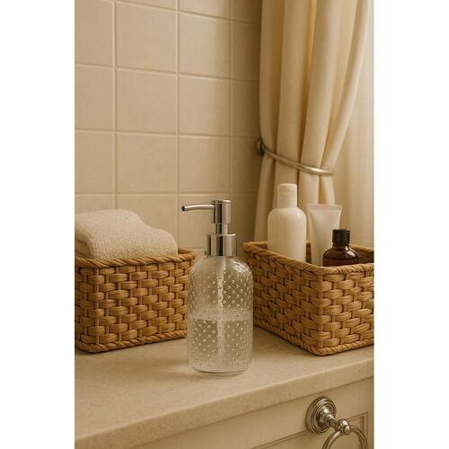 Adicione elegância e praticidade ao seu banheiro ou cozinha com o Dispenser de Sabonete Líquido em Vidro Texturizado. Com capacidade de 430ml, ele é ideal para armazenar sabonete líquido, detergente, álcool gel ou loções hidratantes com estilo. Fabricado em vidro resistente, o dispenser possui um design sofisticado com textura em relevo e acabamento moderno. A válvula dosadora em plástico metalizado proporciona um uso suave e preciso, evitando desperdícios.
