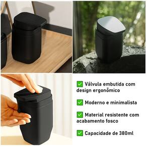 O porta sabonete líquido Ou da Linha Aura combina um design minimalista com válvula ergonômica, que pode ser acionada com o pulso para mais higiene e conforto. Com acabamento fosco e capacidade de 380ml, traz sofisticação e funcionalidade, evitando reposições constantes. Ideal para ambientes úmidos e ainda substitui embalagens descartáveis, oferecendo uma solução sustentável para o dia a dia.
