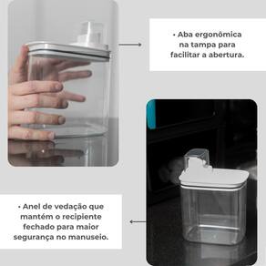 Capacidade de 1,5L, ideal para diferentes tipos de produtos de limpeza; Tampa medidora com gravação de gradação em mL; Aba ergonômica na tampa para facilitar a abertura; Anel de vedação que mantém o recipiente fechado para maior segurança no manuseio; Tampa com sistema de caimento interno para retornar o líquido que sobra.