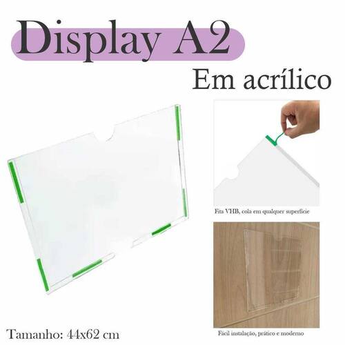Tamanho do display: 44 Cm de altura X 62 Cm de largura Cor: Transparente Espessura: 2 mm Qualidade: Virgem