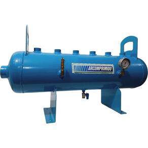 Distribuidor de Ar Manifold 06 saídas DH25-6 (mod.1) com 02 conexões nas calotas, 01 de 2'' e 01 de 1". 06 saídas superior de 1". Luvas laterais para acessórios de segurança (manômetro e válvula de segurança) de 1/4'' e luva inferior de 1/4'' (dreno). Pressão máxima de trabalho 12,3kg/cm. Dimensões; Altura: 350 mm, Comprimento total: 1030 mm, Diametro corpo: 180 mm, Altura total com alça de movimentação: 430 mm. Acompanha documentação com certificado de teste hidrostático. Acompanha os acessórios de segurança manômetro, válvula de segurança e dreno Manual - necessários para uso.